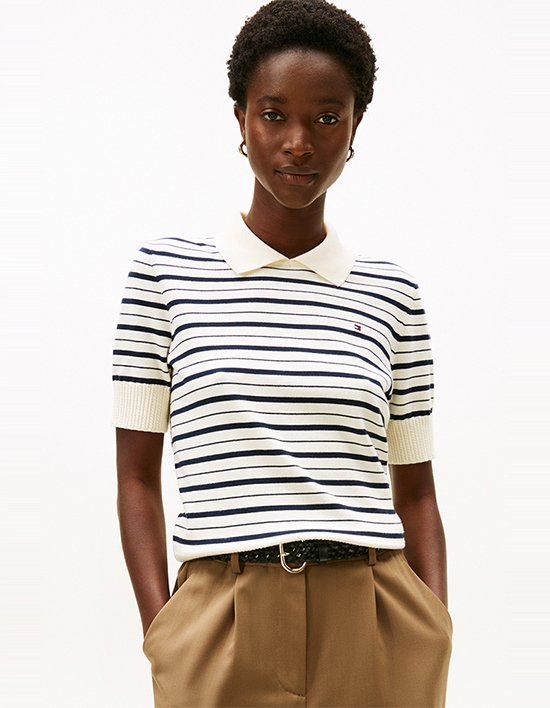 Fit 레귤러 핏부드러운 코튼 원사로 완성된 저지 칼라형 반팔 스웨터로, 편안한 착용감과 깔끔한 외관이 특징입니다.변형