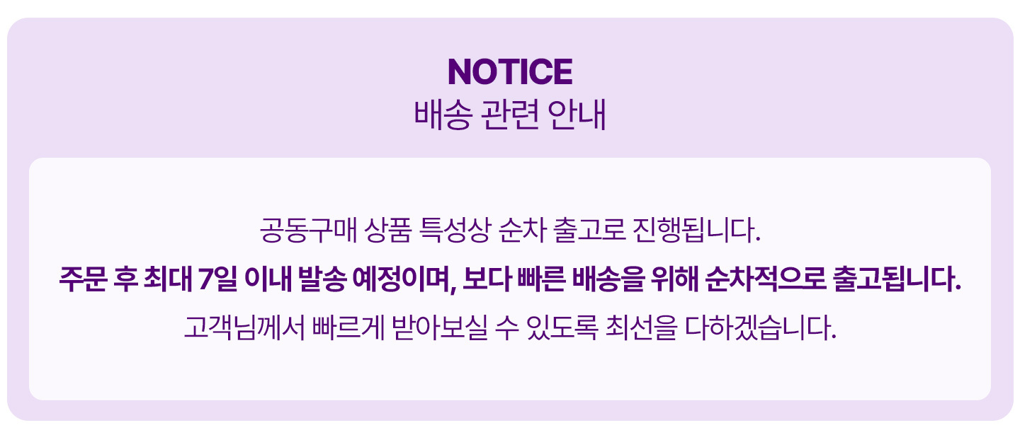 배송 과정 중 기상 악화 및 도로교통 상황에 따라 부득이하게 지연 배송이 발생될 수 있습니다.