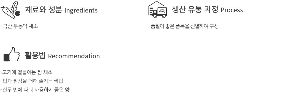 친환경 잎채소의 경우 당일 수확 또는 하루 전날 수확하여 고객분께 보내드리고 있습니다. 간혹 생기가 있지 않고 흐물흐물 거리는 이유는 여름철 계절적 이슈로 날씨가 더워 생장은 빨라 규격은 커질 수 있으나 세포는 정상적으로 성장하지 못하여 탄력이 없고 힘이 없어 흐물흐물 거리는 것으로 절대 오래 보관된 상품을 배송 해드리지 않는 점 안내드립니다. 산지 수확 사정에 따라 간혹 품질이 안좋은 쌈채를 다른 품목으로 대체하여 품질을 높이고자 구성이 바뀔 수 있습니다. 식품 특성상 중량은 3% 내외의 차이가 발생할 수 있습니다.