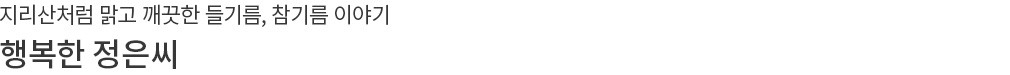 품질 좋은 깨로 짜낸 똑똑한 기름 농사지은 깨로 들기름과 참기름을 짜겠다고 하니 모두가 만류했습니다. 하지만 그녀는 직접 농사지은 깨끗한 깨를 세척하는 것부터 시작하여 건조하고 짜내는 온도와 방식 하나하나를 다르게 하며 연구에 매달렸고, 그 결과는 놀라웠죠. 품질 좋은 깨를 생으로 짜낸 기름은 영양성분이 뛰어났고, 맛과 향도 기가 막혔어요. 젊은 나이에 서울에서 내려와 농사까지 똑부러지게 짓는 그녀를 동네 사람들은 '똑똑한 정은씨'라고 불렀습니다. 그래서 처음 기름을 짜서 팔기로 했을 때, 그녀는 당연히 '똑똑한 정은씨의 들(참)기름'이라는 이름을 붙일 생각이었어요.