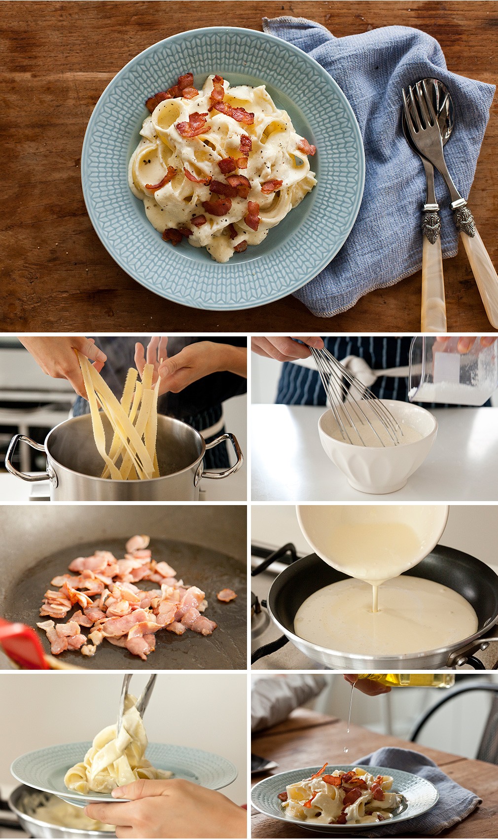 재료 라 파브리카 트러플 파스타 면 100g, 무가당 생크림 1컵, 달걀노른자 1개, 파마산 치즈 1/2컵, 베이컨 3-4줄, 소금, 후추, 화이트 트러플 오일