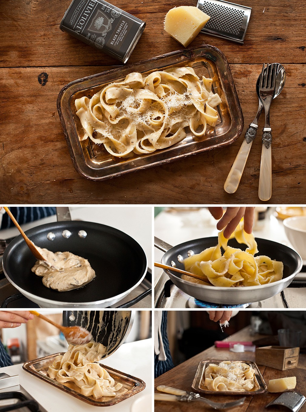 2. 팬에 트러플 크림을 넣고 가열해준다. 크림이 녹기 시작하면 삶아둔 면을 넣고 골고루 소스가 배어들게 한다.