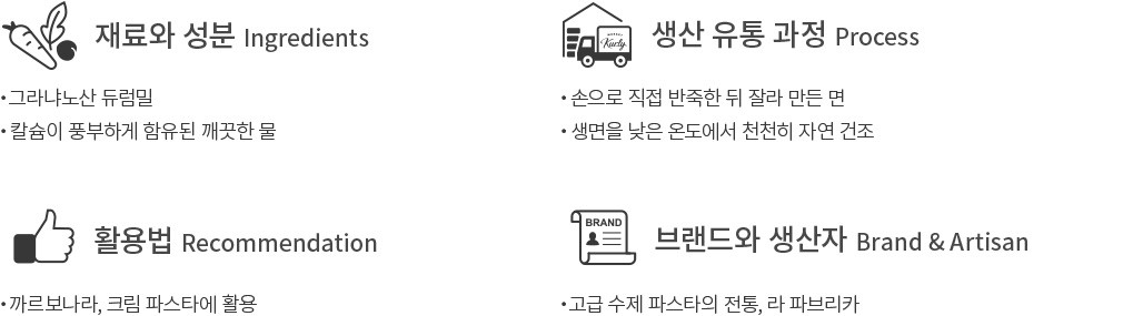 '라 파브리카 델라 파스타 디 그라냐노'는 '그라냐노의 파스타 공장'이라는 의미를 갖고 있습니다. 그라냐노는 파스타의 고향이라고 불릴 정도로 600여 년 이탈리아 파스타의 역사가 그대로 살아있는 지역입니다. 아말피 공화국 시절 이 작은 도시에 무려 140여 곳의 파스타 제조사가 있었고 오로지 파스타를 수송하기 위해 철도가 설치됐습니다. 파스타가 최초로 만들어진 지역은 아니지만 최적의 환경과 장인들의 열정이 이곳을 파스타의 도시로 만들었습니다. 라 파브리카의 파스타는 그라냐노의 장인정신을 이어받은 수제 파스타 브랜드입니다.