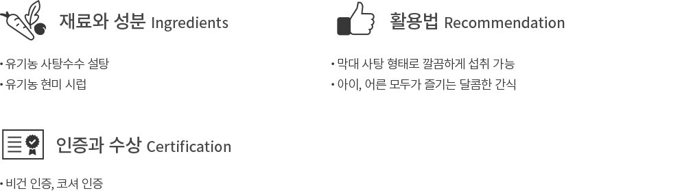 ・특징 : 망고맛, 포도맛, 블루베리맛, 딸기맛, 석류맛까지 총 다섯 가지 맛의 유기농 막대사탕을 담았어요.