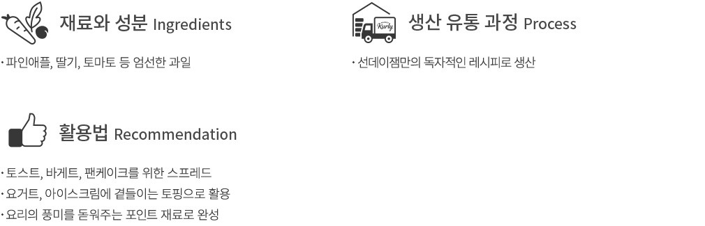 - 카야잼: 계란 함유 / 토마토,우유와 같은 시설에서 제조 - 파인애플 키위잼: 토마토,우유,계란과 같은 시설에서 제조 - 스트로베리 프리저브: 토마토,우유와 같은 시설에서 제조 - 토마토 처트니: 토마토,우유,계란과 같은 시설에서 제조 - 블루베리 밀크잼: 우유 함유 / 토마토,계란과 같은 시설에서 제조 - 얼그레이 밀크잼: 우유 함유 / 토마토,계란과 같은 시설에서 제조 - 딸기 리치잼: 토마토,우유,계란과 같은 시설에서 제조 - 녹차 밀크잼: 우유 함유 / 토마토,계란과 같은 시설에서 제조