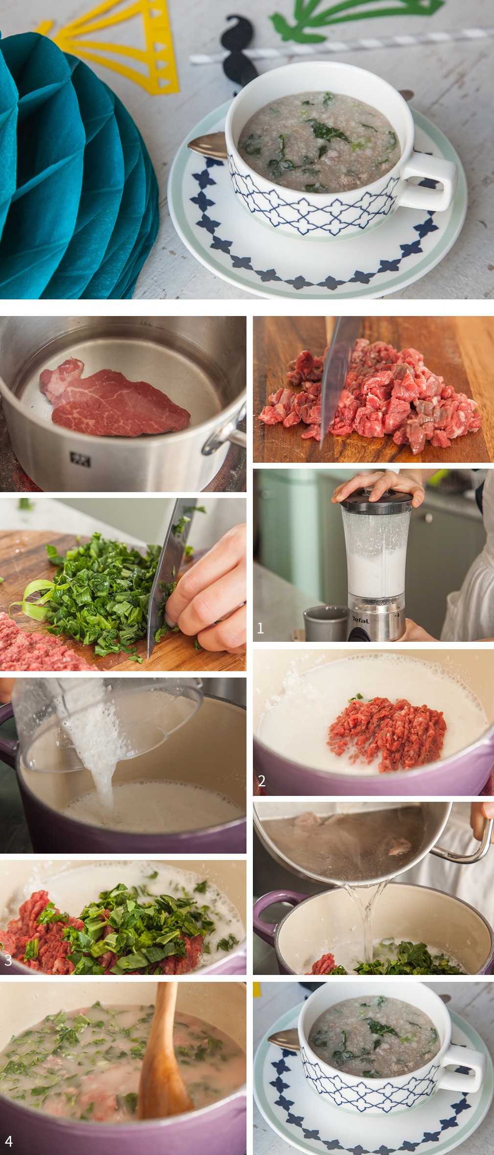 2. 핏물을 뺀 소고기 안심은 50g씩 나눠 한 덩어리는 잘게 다지고, 다른 덩어리는 물 3컵을 붓고 육수를 우려내세요.