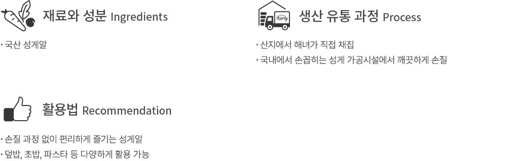 둥근 공 모양에 삐죽 빼죽 가시를 세우고 있는 성게, 그 모양이 밤송이를 연상케 해 우리말로 밤송이 조개라는 귀여운 이름으로 불리기도 합니다. 국내에 서식하는 성게만 따져봐도 약 30여 종으로 철에 따라 종류도 다양해 말똥성게, 분홍 성게 등 부르는 이름도 정해져 있죠. 그중에서 컬리는 제철을 맞아 속이 꽉 들어찬 보라성게를 갓 잡아올려 손질한 생성게알을 가지고 왔어요. 성게 크기에 비해 양이 적은 탓에 좀처럼 맛보기 쉽지 않은 귀한 생성게알을 간편하게 만나보세요.