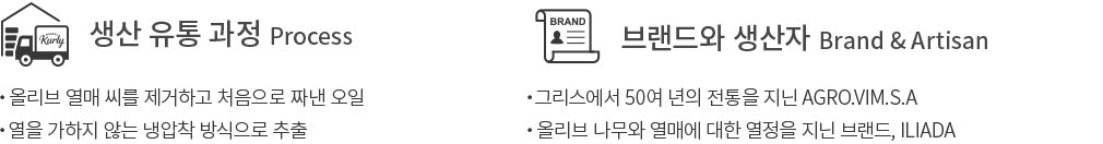 올리브 나무와 올리브 열매에 대한 사랑, 깊은 지식으로 제품의 모든 제조과정에 힘을 쓰는 열정적인 브랜드입니다. 일리아다(ILIADA) 브랜드 제품을 생산하는 AGRO.VIM.S.A사는 1964년 설립되어 50년 전통을 지닌 곳으로, 전 세계에 올리브 오일을 수출하고 있습니다. 뛰어난 제품 특징을 유지하면서 전통성이 손상되지 않게, 수확부터 품질 검사까지 하나하나 수작업으로 꼼꼼히 생산합니다.