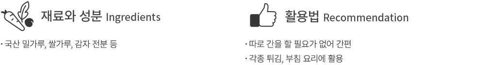 - [우리밀] 튀김가루 500g : 밀 함유 - [우리밀] 부침가루 500g : 밀 함유 (공통) 메밀 와 같은 시설에서 생산