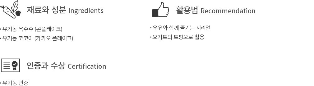 - 유기농 콘플레이크 : - - 유기농 카카오 플레이크 : 밀 함유 - 아몬드 및 견과류, 참깨, 대두, 우유, 계란, 셀러리와 같은 시설에서 생산