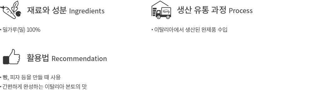 이탈리아 밀가루, 어렵지 않아요 이탈리아 밀가루는 국내처럼 강력분, 중력분, 박력분으로 구분되어 있지 않아요. Pizza는 피자 전용 밀가루, Dolci는 과자용, Semola는 세몰리나로 파스타면을 만들 때 사용합니다. 마지막으로 Farina는 다양하게 사용할 수 있는 밀가루예요. 제분된 정도에 따라 00, 0, 1, 2, 인테그랄레, 이렇게 5가지 타입의 tipo로 구분 됩니다. 이 수치는 제분 후 남아 있는 밀기울(밀가루에서 가루를 빼고 남은 찌꺼기)의 양을 뜻해요. 숫자가 클수록 밀기울이 많은 거친 느낌의 밀이며, 인테그랄레는 통밀에 가깝습니다. 컬리가 소개해 드리는 “00” 클라시카 밀가루는 제분 후 남아 있는 밀기울이 거의 없는 백밀가루랍니다. 입자가 아주 고와서 글루텐이 안정적으로 형성되기 때문에 제빵뿐만 아니라 다양한 요리에 사용하기 좋습니다.