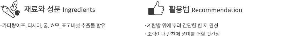 - 대두, 밀, 조개류(굴) 함유 - 계란, 우유, 고등어, 새우, 돼지고기와 같은 시설에서 생산