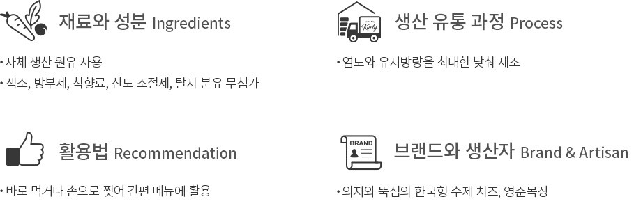 아기 다루듯 사랑을 담아 만든 치즈 치즈를 대하는 영준목장의 마음가짐은 치즈의 순백색과 닮아 있어요. 아기를 키울 때처럼 사랑을 듬뿍 줄수록 치즈의 품질도 좋아진다고 믿기에 예쁘다고 치즈에 말을 걸어 주기도 하고, 잔잔한 음악을 틀어 주기도 하는 등의 정성을 기울이죠. 치즈를 만드는 과정에서도 색소, 방부제, 착향료, 산도 조절제, 탈지 분유를 첨가하지 않고 자연 그대로의 순수한 치즈를 추구합니다.