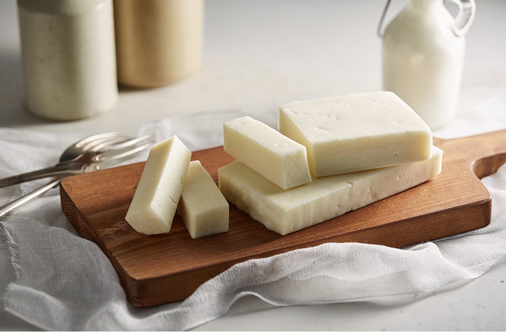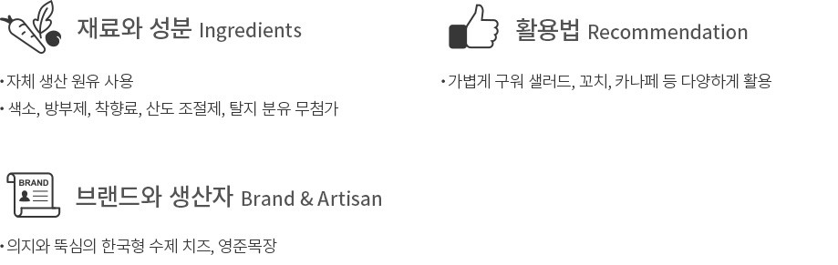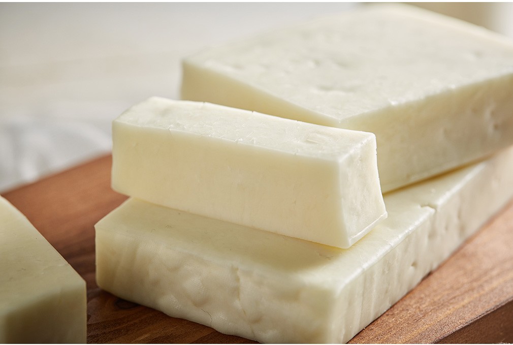 ・특징 : 구이용으로 만든 치즈입니다. 손으로 눌러 커드에 남은 유청을 더 빼는 ‘니딩’ 방식으로 독특한 조직감을 자랑해요.