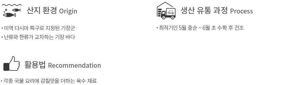 난류와 한류가 만나는 최적의 산지, 기장 부산 해운대에서 울산 방향으로 올라가다 보면, 기장 바다가 나타나요. 동해와 남해가 만나는 이곳엔 플랑크톤이 가득해 미역과 다시마가 자라기 적합합니다. 게다가 물살이 세고 수심이 깊으면서 일조량까지 풍성해요. 이런 천혜의 환경은 다시마의 맛을 담보해 주지요. 조선 시대에는 기장군에서 생산된 건어물이 궁중 진상품으로 대우를 받을 정도였다고 합니다. 현대에 이르러, 기장군은 미역 다시마 특구로 지정받으며 과거의 명성을 그대로 지키고 있어요. 컬리가 소개하는 다시마는 다시마의 품질이 가장 뛰어난 5월 중순에서 6월 초에 생산된 상품이에요. 바다에 산호가 끼기 전에 수확해 자연에서 정성껏 말렸답니다. 바다 내음을 그대로 간직한 기장 다시마는 육수용으로 가장 좋습니다.