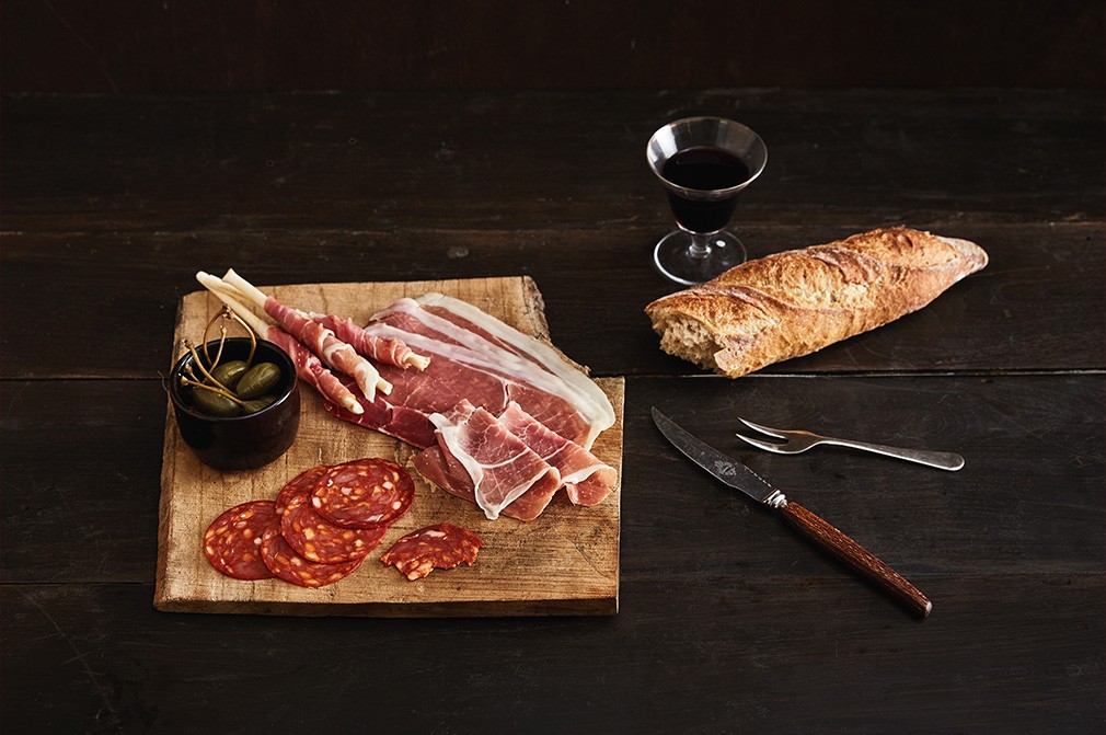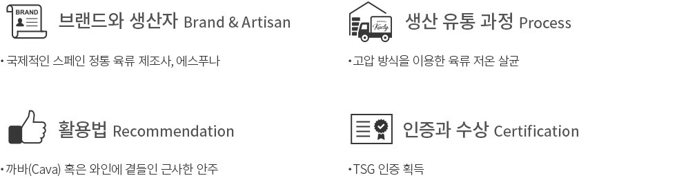 일반 백돼지로 만드는 '세라노(Serrano)'는 스페인어 'Seirra'에서 파생된 단어로 산이라는 뜻으로 춥고 건조한 산지에서 만들어졌음을 의미해요. 즉, 사료를 먹여 축사에서 사육한 일반 백돼지를 6~15개월 정도 숙성시켜 만든 하몽이죠. 이베리코 하몽에 비해 숙성 기간이 현저히 짧은 특징을 가지고 있는데 건조와 숙성 기간에 따라 보데가(9~12개월), 레세르바(12~15개월), 그란 레세르바(15개월)로 나뉜답니다.