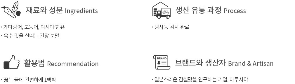 우리의 혀가 인지하는 대표적인 맛은 단맛, 짠맛, 신맛, 쓴맛이죠. 4가지 맛으로 도저히 설명할 수 없는 제5의 맛이 있어요. 이 맛을 일본인들은 맛있는 맛이라는 뜻의 '우마미(旨味)'라 불러요. 우마미를 잘 살린 음식은 사람들의 감동을 자아내는데요. 마루사야의 간사이풍 다시팩 하나면 누구나 만족할 요리를 만들 수 있습니다. 홍차 티백을 우리는 것처럼, 냄비에 1팩씩 툭툭 넣고 사용하는 형태라 아주 편하죠. 한번 사용해보면 '어쩜 이렇게 손쉽고도 맛있게 육수를 만들 수 있을까?' 하고 스스로 놀라게 된답니다.
