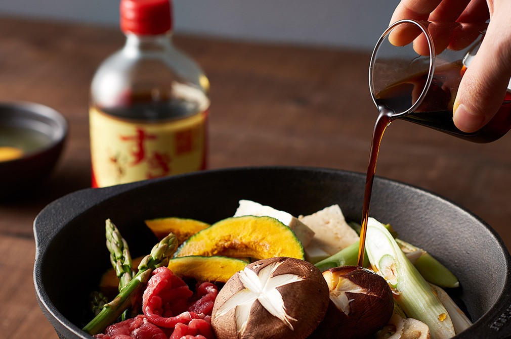 1. 바닥이 넓고 편평한 전골냄비에 스키야키 소스를 조금씩 부어준 후 끓기 시작하면 고기를 먼저 올려주세요.
