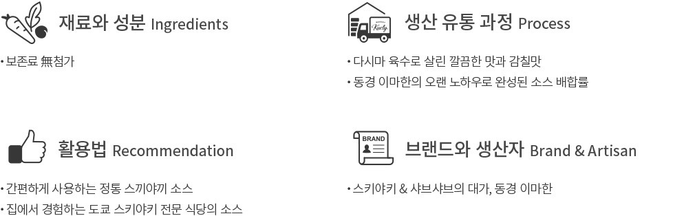 '이마한'의 스키야키 소스는 오랜 세월동안 익힌 노하우로 보존료 없이, 필요한 재료만 적절히 배합해 일본인이 선호하는 현지의 맛을 잘 살려냈어요. 간장, 미림, 설탕에 청주와 다시 육수를 함께 혼합해 달달하면서도 깔끔한 맛을 느낄 수 있어요. 품질 좋은 고기와 '이마한' 스키야키 소스만 있다면, 언제든지 정통 스키야키의 맛을 즐기실 수 있어요.
