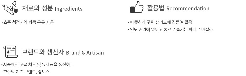 파니르 치즈에 대해 들어보셨나요? 숙성시키지 않은 인도식 치즈로 주로 그냥 먹기보다는 요리에 많이 사용되는 치즈에요. 잘 녹지 않기 때문에 구워 먹거나 커리나 인도의 난(Naan) 브레드에 넣어 먹기도 하죠. 호주의 프리미엄 치즈 브랜드, 램노스는 단단한 두부와 세미 하드 치즈 중간 정도의 식감에 담백한 맛을 지닌 파니르 치즈를 선보여요. 오일을 두른 팬에 살짝 구워내기만 해도 겉은 바삭 속은 부드러운 파니르의 매력이 생생하게 전해질 거예요.