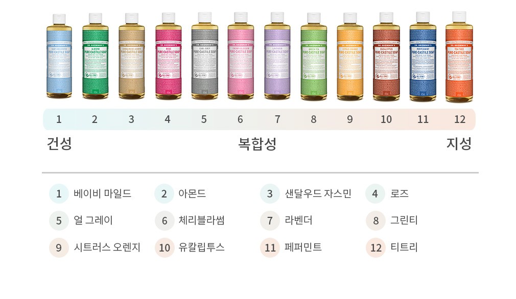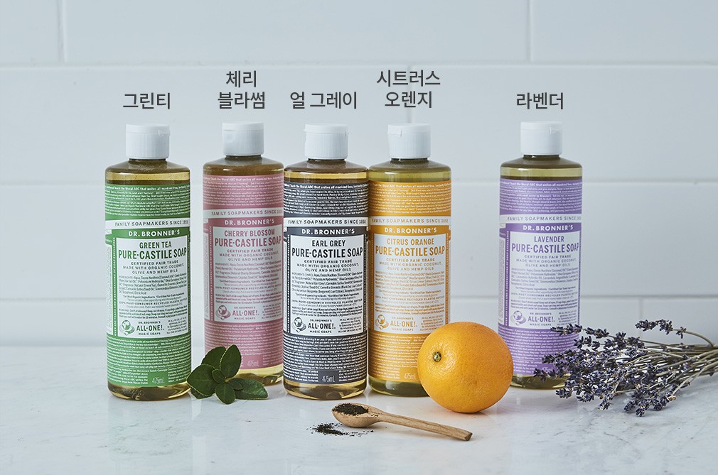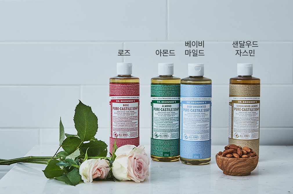 내게 맞는 퓨어 캐스틸 솝 고르기 어떤 클렌저를 골라야 할지 막막하다면, 컬리의 가이드라인을 따라오세요. 닥터 브로너스 캐스틸 솝 12가지 제품에는 올리브오일, 호호바씨오일 등에서 유래된 성분이 공통으로 들어 있습니다. 제품의 종류를 가르는 기준은 향을 내는 일부 성분이에요. 내 취향에 맞는 향은 무엇인지, 내 피부 타입에 적합할지 이 두 가지만 따져도 손쉽게 원하는 제품을 고를 수 있답니다. 컬리에서 구입할 수 있는 용량은 475ml와 950ml 두 가지입니다. 욕실에 두고 쓰기에 가장 만만한 기본 사이즈를 찾는다면 475ml 제품을 고르세요.