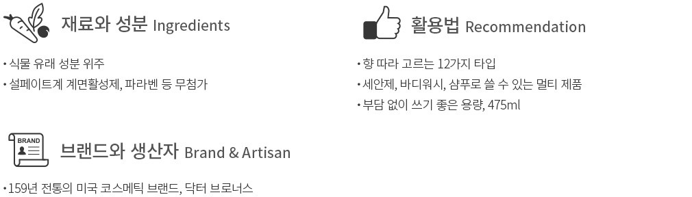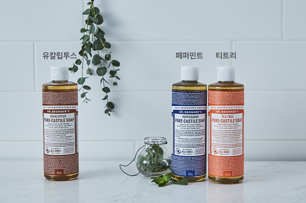 ・특징 : 유칼립투스의 향은 벌레가 싫어하기로 유명한데요. 유칼립투스는 깨끗함의 대명사처럼 느껴져요. 닥터 브로너스는 유칼립투스 오일을 사용해 퓨어 캐스틸 솝을 만들었답니다. 피부는 물론이고 머릿속까지 시원해지는 느낌을 받을 거예요.