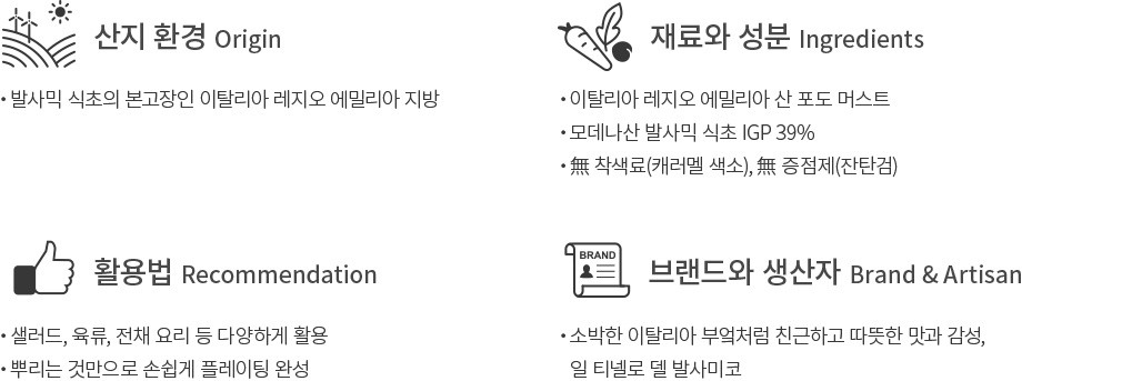 이탈리아 본고장에서 만든 진짜 발사믹 글레이즈 일반 식초인 비네거(vinegar)와 발사믹 비네거의 차이점이 포도 생산지에 있다는 점 알고 계셨나요? 발사믹 비네거란 이름으로 불리려면 레지오 에밀리아 지방이나 이탈리아 북부에 위치한 모데나 지방에서만 나온 포도 품종으로 만들어야 해요. 일 티넬로 델 발사미코의 발사믹 글레이즈는 이탈리아 레지오 에밀리아에서 수확한 포도의 머스트에 모데나산 발사믹 식초 IGP를 39% 함유했어요. 주로 사용된 포도는 청포도 품종인 트레비아노와 적포도 품종인 람부르스코로, 둘 다 당도가 높지 않아 발사믹 식초를 만들기에 이상적인 품종이랍니다.