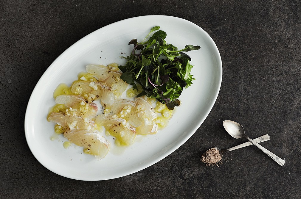 4. 접시에 광어회를 놓은 뒤 ③에서 만든 드레싱을 뿌린다.
