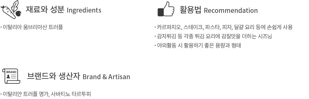 진귀한 트러플을 조금이나마 간편하고, 더 자주 사용하기 위해 사람들은 다양한 트러플 가공식품을 개발해 왔어요. 트러플 소금, 트러플 오일, 트러플 꿀, 트러플 치즈 등 컬리에서 판매하는 트러플 식품만 해도 그 종류가 참 다양하지요. 트러플의 진가를 알아보는 미식가라면 트러플의 매력을 제대로 느낄 수 있는 트러플 제스트도 놓치지 마세요. 컬리가 소개하는 트러플 제스트는 오프라 윈프리가 가방 속에 넣고 다니며 사용한다는 이탈리안 브랜드, 사바티노 타르투피의 대표 제품입니다. 세계적으로 유명한 이탈리아 움브리아산 트러플을 사용해 만든 만큼, 트러플의 풍미를 제대로 느낄 수 있어요. 일단 한 번 사용해 보면, 오프라 윈프리가 왜 트러플 제스트를 가지고 다니는지 이해하게 될 거예요.