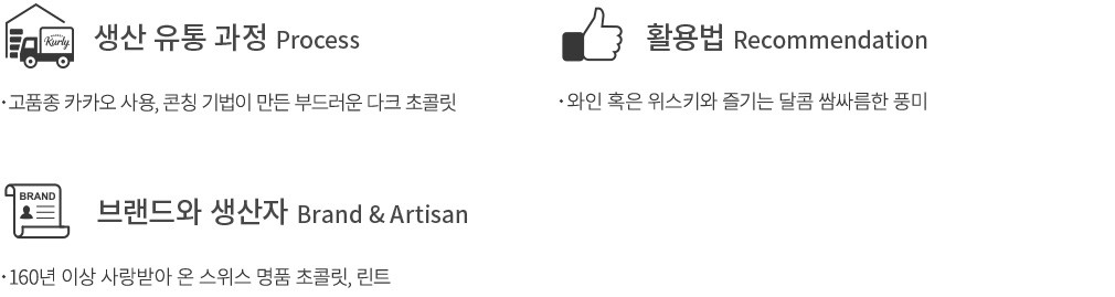 ・테이스팅 노트 : 카카오 특유의 풍미와 살짝 감도는 단맛이 조화로운 초콜릿입니다. 씁쓸하고 달콤한 맛의 조화가 좋은 이 제품은 다크 초콜릿에 입문하는 분들에게 추천드려요. 까베르네 소비뇽, 메를로 와인을 함께 곁들여 보세요.