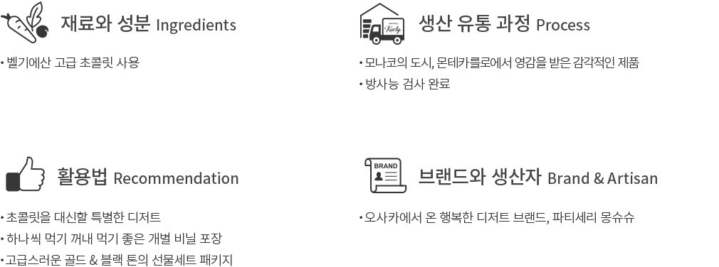 몽슈슈는 한국인 주주로 구성된 독립적인 한국회사이며, 모든 제품의 레시피는 한국 몽슈슈가 독자적으로 소유, 운영하고 있습니다. 몬테카를로 개별 포장재에서 발생하는 이향감은 제품 포장에 사용되는 드라이아이스의 고유의 냄새로, 제품 해동 후 1-2시간 내 날아가는 향으로 섭취에는 이상 없음을 안내드립니다.