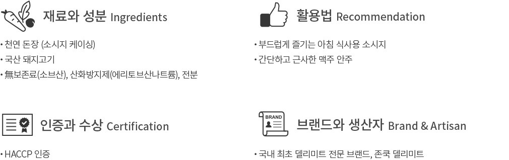 - 돼지고기 함유 - 알류, 우유, 대두, 메밀, 땅콩, 밀, 고등어, 게, 새우, 복숭아, 토마토, 호두, 닭고기, 오징어, 쇠고기, 조개류, 아황산류, 잣 과 같은 시설에서 생산