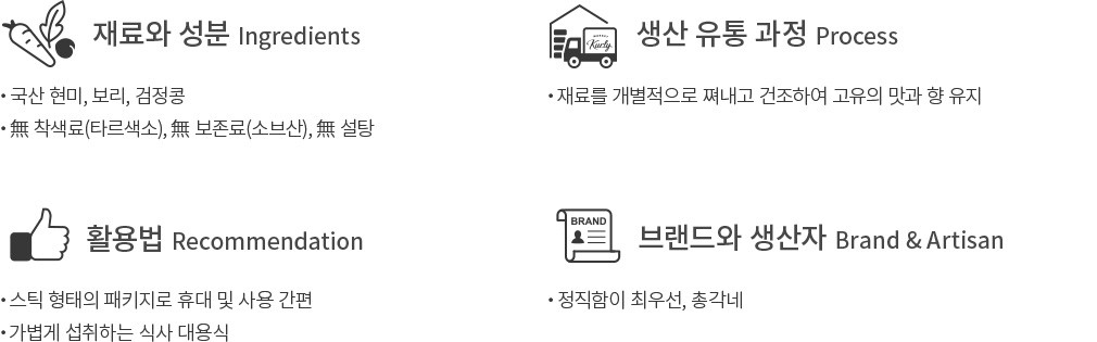영양도 중요하지만 먹기에도 편한 선식을 만들기 위해 총각네는 재료를 일일이 쪄내고 볶은 후 분쇄하여 혼합하는 과정을 선택했어요. 이 과정에서 각 재료들의 고소한 맛과 향은 그대로 남기고 쉽고 간단하게 섭취 할 수 있도록 했습니다. 설탕이나 식품첨가물이 들어있지 않기에 식이요법을 하시는 분도 부담 없이 섭취하실 수 있죠. 총각네의 두유와 아몬드유, 혹은 물이나 우유에 한 포씩 섞어서 식사 대용으로 즐겨보세요. 고소하면서도 부드러운 맛이기에 선식에 익숙하지 않으신 분도 편하게 드실 수 있을 거예요.