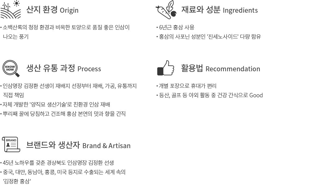 일교차가 크고 서늘한 기후와 배수가 잘 되는 토질을 갖춘 풍기는 인삼 재배를 위한 환경적 조건이 탁월해요. 재배 방법의 경우 풍기 인삼을 대표하는 김정환 홍삼은 우선 평탄지나 완경사지를 선정해 배수가 더욱 잘 되도록 합니다. 또 비옥한 토질을 유지하기 위해 한번 사용한 토양은 2년간의 휴지기를 갖게 되는데요. 이 기간 동안 인삼 밭의 거름으로 사용되는 수단그라스를 심어 땅에 양분을 공급합니다. 이러한 조건에서 자라난 풍기 인삼은 향이 강하고, 육질도 단단하죠.