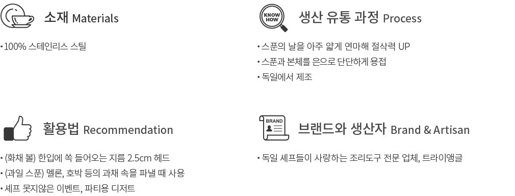 ・ 특징 : 멜론이나 호박 속을 파낼 때 사용하기 좋은 스푼입니다. 아이스크림을 퍼내는 스쿱으로 활용해도 좋아요.