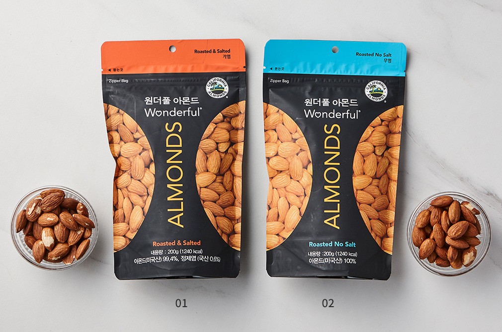 컬리가 선택한 파라마운트 팜즈의 피스타치오와 아몬드는 연간 20만 톤을 생산할 정도로 전문적인 농장에서 재배, 가공돼요. 일조량이 풍부하고 땅이 기름진 캘리포니아 지역에서 100% 자연 숙성을 거치는 만큼 무척 고품질의 아몬드가 생산되죠. 원더풀은 그 중에서도 외피가 얇고 표면이 매끈한 논파레일(Nonpareil)아몬드만을 사용해요. 파라마운트 팜즈만의 로터리 로스팅 방식으로 별다른 식품첨가물없이 깔끔하고 신선하게 가공된 아몬드는 아이들이 먹기에도 안전하답니다. 매일매일 즐기는 간식이라면 고소한 무염 아몬드를, 조금 더 스낵처럼 즐기고 싶은 분께는 가염 아몬드를 권해드릴께요.