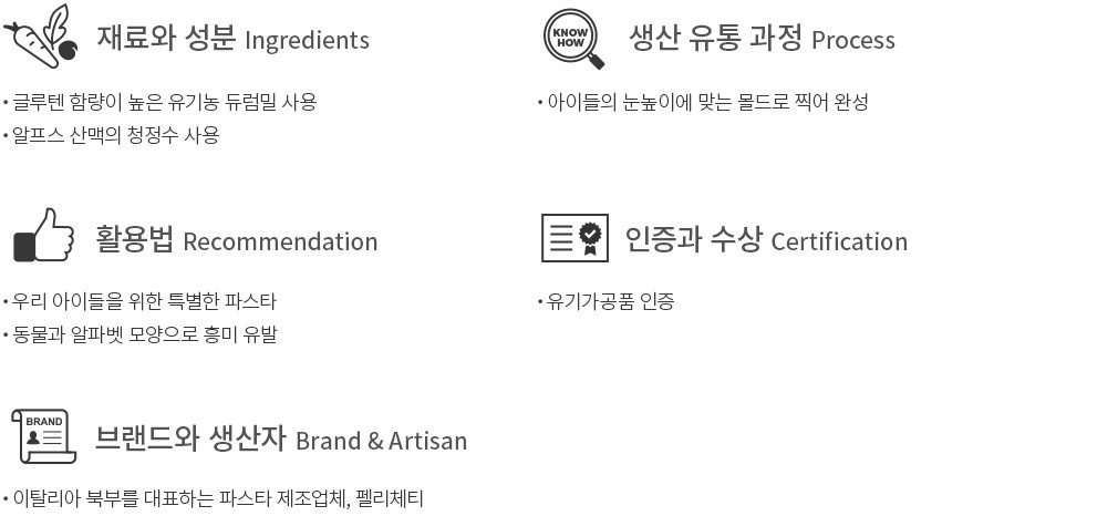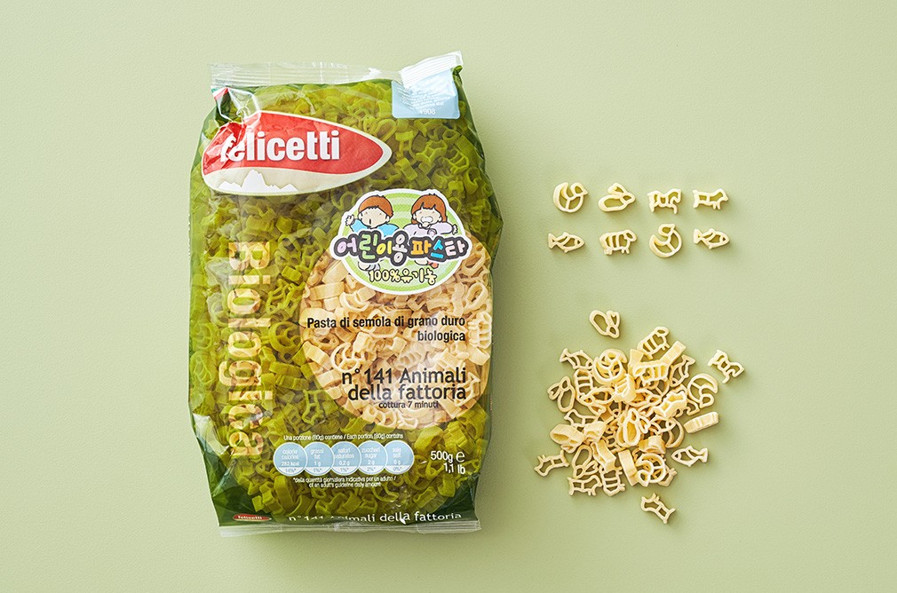 아이들은 음식을 통해 세상을 보고 듣고 배워요. 펠리체티의 아이 전용 숏파스타를 조리해 아이들에게 이탈리아의 식문화를 간접 경험하게 해 주세요. 특히 펠리체티 제품은 아직까지 파스타와 친하지 않은 아이들에게 적합합니다. 면의 모양이 재미난 동물과 교육적으로도 좋은 알파벳이라 아이들이 파스타를 보면서 호기심을 가지고 재미를 느끼거든요. 아이가 먹을 파스타이니 어떤 재료로 어떻게 만들어지는지도 중요한데요. 펠리체티는 유기농으로 재배한 듀럼밀에 알프스 지역의 청정수를 넣고 반죽한 뒤 몰드에 면을 찍어내고 건조시킨다고 해요. 재료가 뛰어나면서도 위트까지 넘치는 유기농 제품으로 아이의 마음을 사로잡아 보세요.