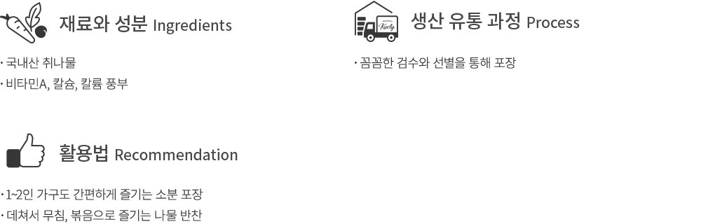 활용팁 ・취나물의 향을 온전히 즐기기 위해서는 마늘, 고춧가루 등 양념을 세게 넣지 않는 것이 좋아요. 고유의 강한 향이 부담스럽다면 참기름을 살짝 넣어 조리해보세요.