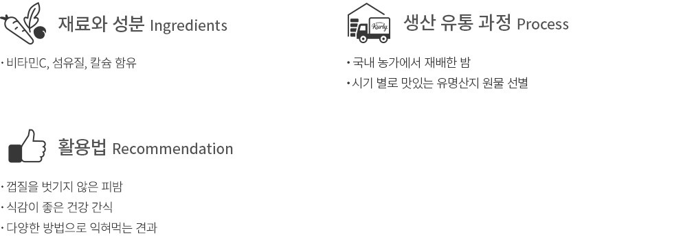식품 특성상 중량은 3% 내외의 차이가 발생할 수 있습니다. 수확한지 얼마 되지 않은 햇밤으로, 냉장고 혹은 김치냉장고에 2~4일 정도 후숙 후 드시면 더욱 맛있게 드실 수 있습니다.