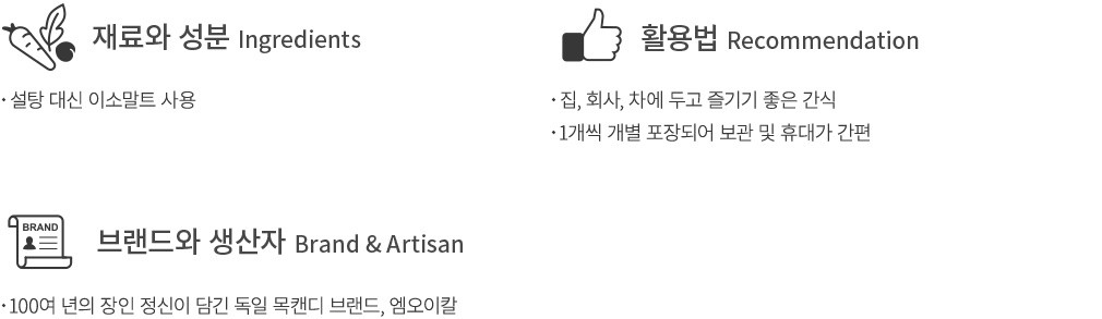 ・특징 : 생강 추출물과 오렌지 주스 농축액, 사과 농축액 등을 더해 만든 캔디입니다. 생강 특유의 알싸한 풍미와 오렌지의 상큼한 맛이 조화롭게 어우러져요.