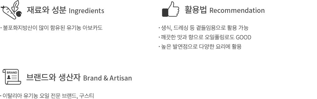 ・유의사항 : 기름은 발연점 이상으로 조리 시 맛과 향이 변할 수 있습니다. 반드시 발연점 이내 온도에서 사용해주세요.