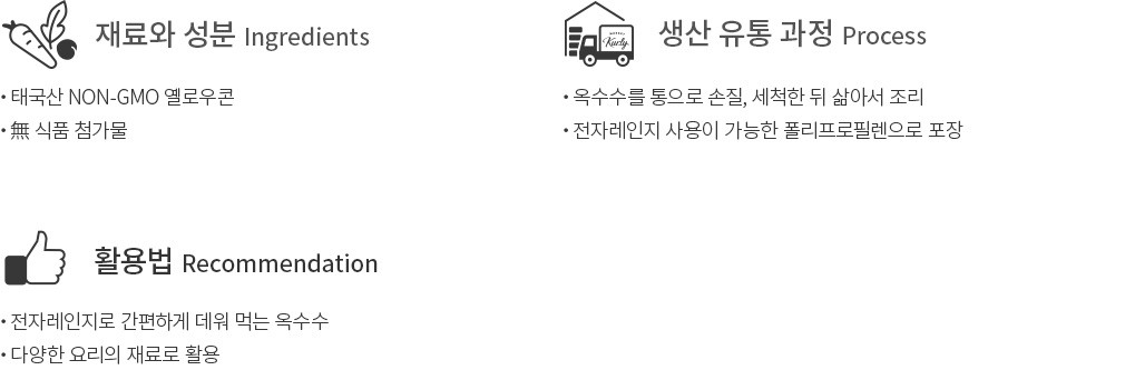 노랑 옥수수의 매력은 알이 단단하게 영근 찰옥수수의 고소함과는 다른 촉촉하고 달콤한 맛이지요. 흔히 스위트콘 통조림으로 만나오던 노랑 옥수수를 이번에는 통째로 즐겨보세요. 통통한 알이 소담하게 맺힌 옥수수의 수염을 미리 손질하고, 깨끗하게 세척한 뒤 삶아서 포장했답니다. 유전자 변형 걱정이 없도록 NON-GMO 원물만을 사용했기에 더욱 믿음직하죠. 소금이나 설탕 등은 물론, 단 한 가지의 식품 첨가물도 넣지 않았어요. 출출한 시간을 위한 영양 간식이나 요리의 재료로 다양하게 활용해보세요.