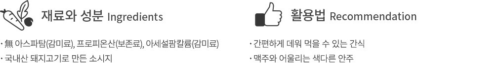 - 달걀, 우유, 대두, 밀, 돼지고기, 쇠고기 함유 - 이 제품은 메밀, 땅콩, 고등어, 게, 새우, 복숭아, 토마토, 아황산류, 호두, 닭고기, 오징어, 조개류(굴, 전복, 홍합 포함), 잣을 사용한 제품과 같은 제조시설에서 제조하고 있습니다.