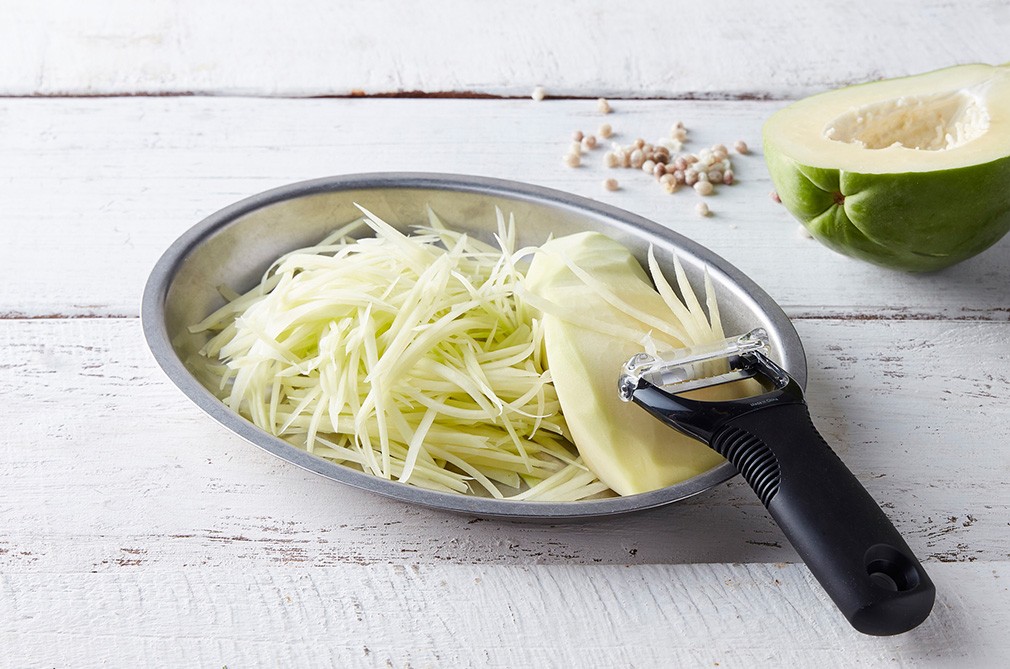속이 주홍빛으로 익은 파파야는 달콤한 맛을 내는 과일이지요. 하지만 이번에 소개하는 그린 파파야는 '무맛'에 가까워 과일로 먹기는 힘이 들어요. 대신 아삭거리는 식감으로 동남아 등지에서 채소의 역할을 톡톡히 하고 있는 이색 과일이랍니다. 특히나 태국에서는 그린 파파야로 매일 먹는 밥 반찬, 쏨땀을 만들어 먹어요. 채 썬 그린 파파야에 매콤새콤한 소스와 견과류를 더해 입맛을 한층 돋우는 메뉴로 한국에서도 인기가 많지요. 이처럼 샐러드나 볶음 등 식감을 살릴 수 있는 다양한 요리의 재료로 사용해 보세요. 식탁에 이색적인 재미를 더할 수 있을 거예요.