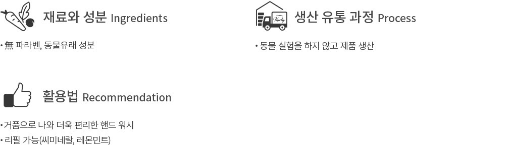 ・사용감 : 입구를 누르면 거품 형태로 나오는 핸드워시입니다. 상큼한 레몬과 민트의 향기가 잘 느껴집니다.