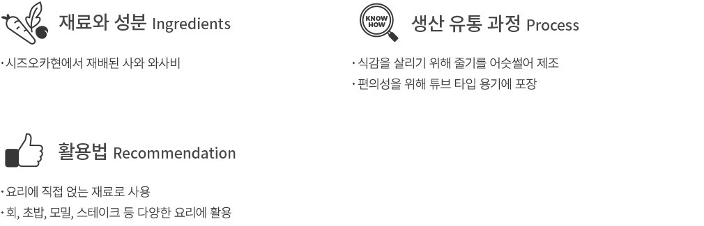 ・주요 원재료 : 와사비 36.15%, D-소비톨, 맥아당, 정제소금, 유채유, 구연산 등