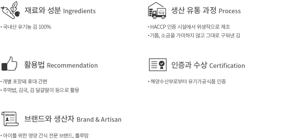 ・특징 : 기름과 소금을 가미하지 않은 국내산 유기농 김입니다. 1봉에 김이 4장씩 개별 포장돼 있습니다.