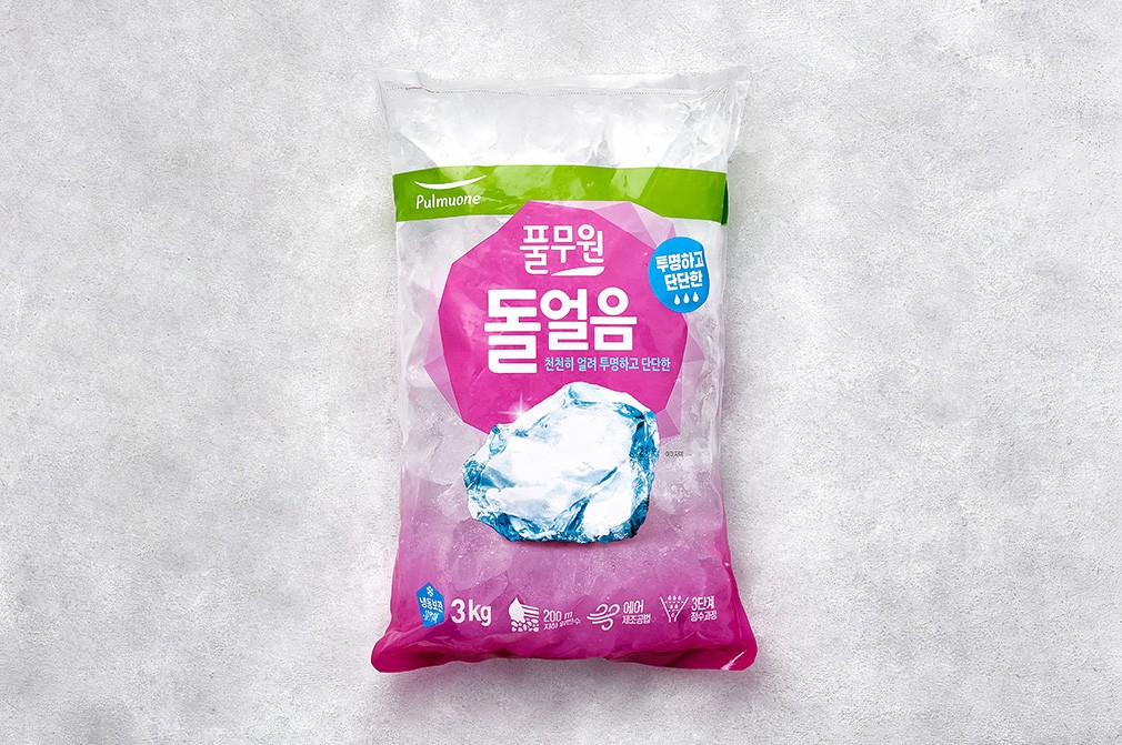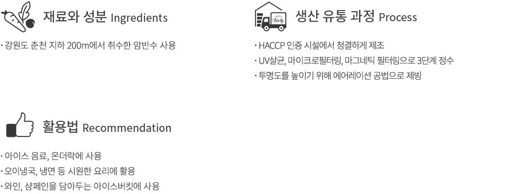 가정에서 만든 얼음은 녹는 속도가 빨라서 음료나 음식의 맛을 빠르게 희석시키는 것이 아쉬워요. 이제 천천히 녹는 투명한 돌얼음을 만나보세요. 지하 200m에서 취수한 암반수를 3단계에 걸친 살균, 필터링으로 꼼꼼하게 정수했어요. 이후, 단단한 얼음을 만들기 위해 80~160kg의 대형 판빙을 느린 속도로 얼리고 잘게 쪼갠 뒤 일정한 크기의 얼음만 선별해서 포장했습니다. 제빙 과정에서 물속의 이온과 기체를 제거하는 에어레이션 공법을 사용해 투명도도 높였지요. 제각기 자연스러운 모양을 하고 있어 더욱 매력적인 돌얼음을 다양하게 활용해 보세요.