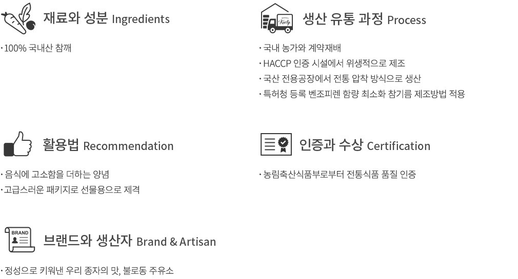 ・테이스팅 노트 : 쌉싸름한 맛이 적고, 참기름만의 구수하면서도 고소한 맛과 향이 진하게 전해져요.