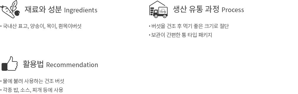 ・구성 : 표고버섯, 양송이버섯, 목이버섯, 흰목이(은이)버섯